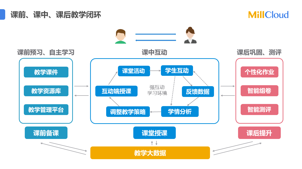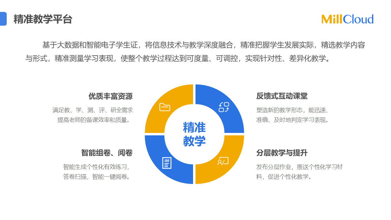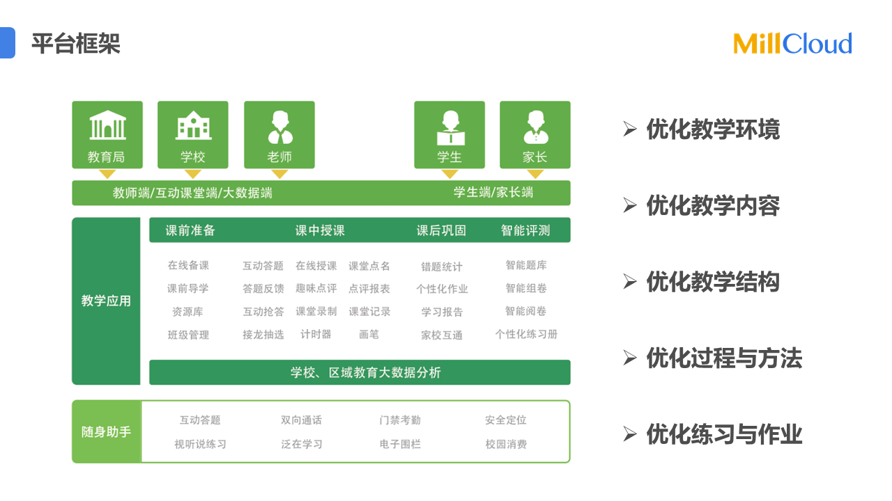 精準(zhǔn)教學(xué)平臺(tái)根據(jù)國家關(guān)于中小學(xué)的雙減要求,在大數(shù)據(jù)與智能硬件(電子學(xué)生證)的支持下,以智慧課堂互動(dòng)為學(xué)習(xí)數(shù)據(jù)采集手段,實(shí)現(xiàn)精準(zhǔn)施教,個(gè)性化學(xué)習(xí),促進(jìn)課內(nèi)減負(fù)增效,涵蓋備課預(yù)習(xí)、課中互動(dòng)、課后個(gè)性化作業(yè)、期末智能測評(píng)、教學(xué)大數(shù)據(jù)增效等學(xué)習(xí)與教學(xué)管理的全過程,實(shí)現(xiàn)因材施教、作業(yè)定量、評(píng)測智能的教學(xué)新目標(biāo)。